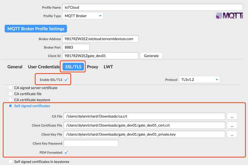 | PEM Formatted | 由于物聯(lián)網(wǎng)通信根證書、設(shè)備證書、設(shè)備密鑰均由 openssl 生成使用 PEM 格式,而 MQTT.fx 是 Java 客戶端,所以不識別 PEM 證書,這里需要勾選由該客戶端自動轉(zhuǎn)換為 Java 識別的 JKS 格式。 |