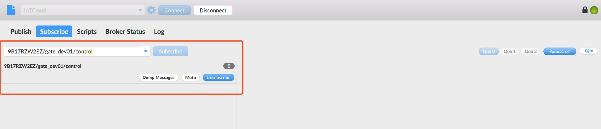 當(dāng)右上角圓形圖標(biāo)為綠色時,說明已連接 IoT Cloud 成功,可進(jìn)行發(fā)布和訂閱操作。