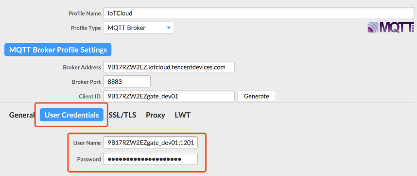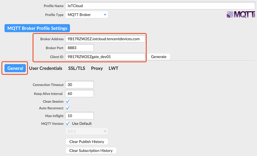| Broker Address | MQTT 服務(wù)器連接地址,廣州域設(shè)備填入:PRODUCT_ID.iotcloud.tencentdevices.com,這里 PRODUCT_ID 為變量參數(shù),用戶需填入創(chuàng)建產(chǎn)品時自動生成的產(chǎn)品 ID,例如 9B17RZW2EZ.iotcloud.tencentdevices.com |