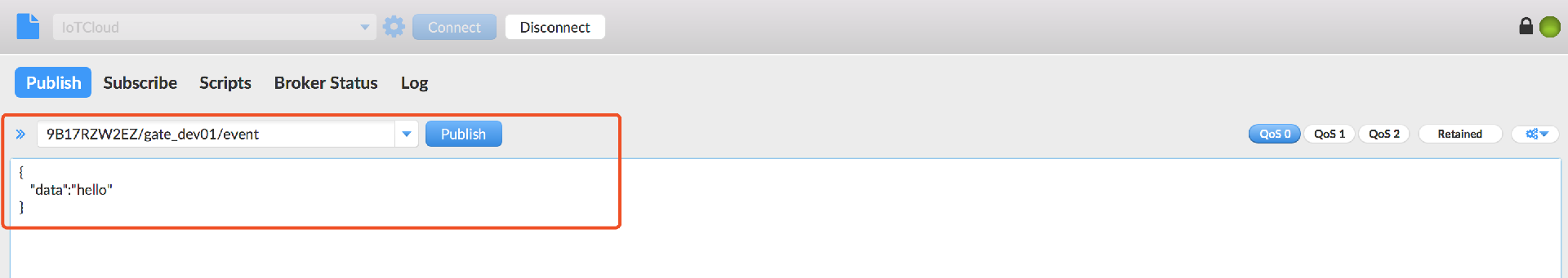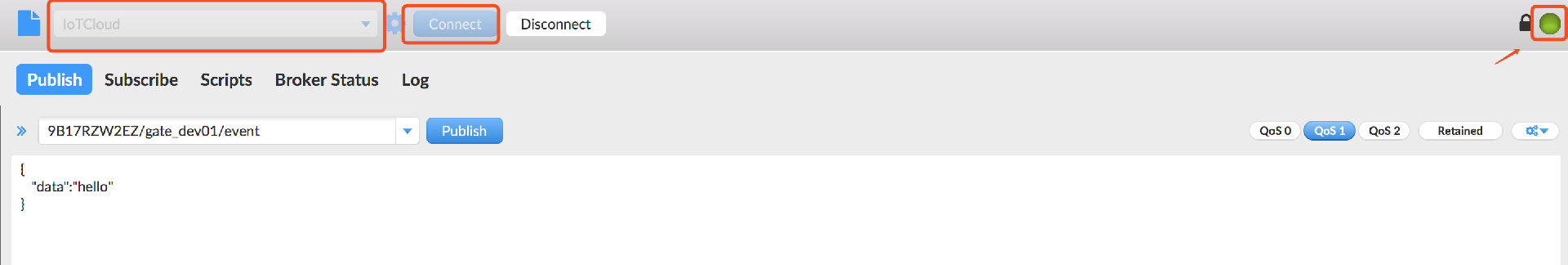 當(dāng)右上角圓形圖標(biāo)為綠色時,說明已連接 IoT Cloud 成功,可進(jìn)行發(fā)布和訂閱操作。